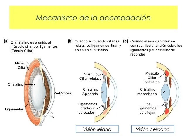 Los rayos de luz de los objetos cercanos son divergentes y requieren más refracción para enfocarlos.